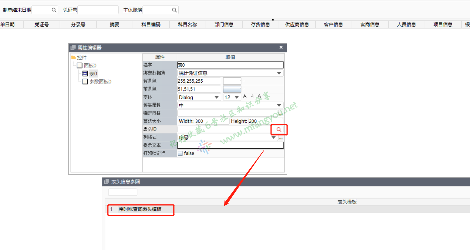 因为考虑到后续将序号列和凭证主键列不显示,所以在表头模板中将这两列删除;