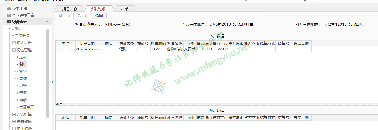 b.查询条件为:对账不平,未对符,可出来总公司对分公司的另一笔分公司1没有的数据